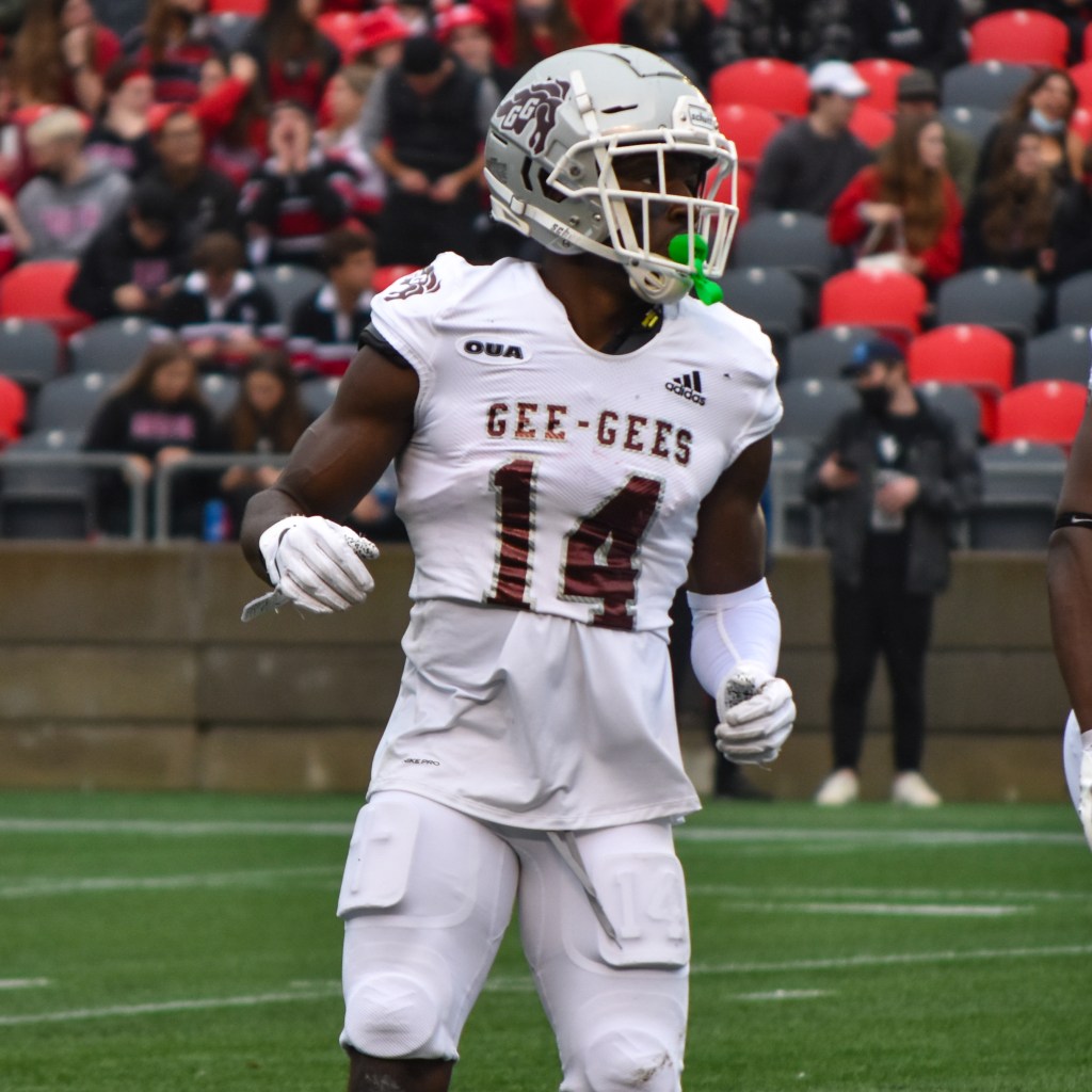 Although quarterback Tanner Dejong has faced injuries which have sidelined him for the majority of the 2021 OUA season, the Carleton University offence has still been able to move the ball. Breaking the school record for most rushing yards in a career, Nathan Carter has been a big piece of the Ravens offence this season, rushing for 318 yards and 2 scores on just 62 carries. Receivers Glodin Mualal and Keaton Bruggeling have led the passing attack, Mualal with 221 yards on 16 catches and Bruggeling with 3 receiving touchdowns but freshman receiver Kaseem Ferdinand is also getting some action on the offence and is showing extreme potential to be the next big thing to come from the Ravens football program. On just 9 receptions over the 5 games played this season Ferdinand has gained 157 yards and scored one touchdown. Ferdinand, despite being 5-foot-10 is a deep threat receiver thanks to his insane speed and agility. In Toronto the Ravens experimented in his deep threat ability, 101 yards and a touchdown later they may have found their number one receiver for the future and suiting up for the second time against the University of Ottawa, he may be a large part of the Ravens game plan against the Gee Gees.